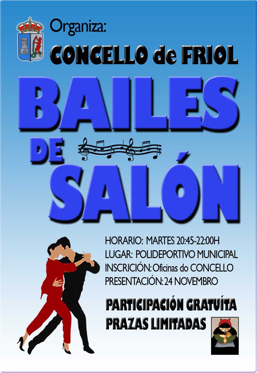 O concello de Friol organiza durante os vindeiros meses un CURSO DE BAILES DE SAL脫N, para dar resposta 谩 grande demanda que trasladan os veci帽os e veci帽as de actividades l煤dicas, que contribuir谩n a aumentar a oferta de lecer durante o inverno no noso rural.
